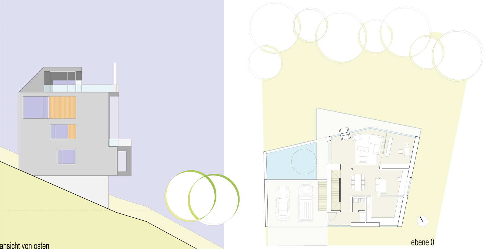 FÜR DIE BEBAUUNG DES EXTREM STEILEN, NACH NORDEN UND OSTEN HIN ABFALLENDEN GRUNDSTÜCKS AN EINER DER STEILSTEN STRASSEN DEUTSCHLANDS WURDE EINE SEHR REDUZIERTE FORMATION AUS DREI GESCHOSSEN UND EINEM SONNENDECK GEPLANT. IN DEN BEIDEN VOLLGESCHOSSEN BEFINDET SICH DIE ÜBER EINEN LUFTRAUM RÄUMLICH VERBUNDENE HAUPTWOHNUNG. UNTERHALB DIESER WOHNUNG IST EINE WEITERE KLEINE WOHNUNG VORGESEHEN. OBERHALB DER HAUPTWOHNUNG ERSCHLIESST SICH DAS SONNENDECK.